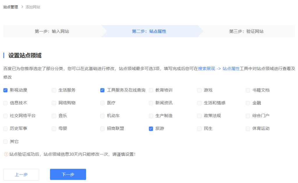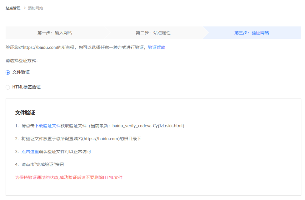 验证网站 – 百度站长 2025年8月28日2025年8月19日 作者 小杨老师 1.添加网站 如果没有百度站长账号,需要注册账号并登录。登录成功后,在站点管理页面点击“添加网站”。见下图: 2.输入网站 在下图中选择网站的协议类型,并输入网站的域名,然后点击下一步。 3.站点属性 根据自己的网站类型,设置站点领域。最多可以选择3个。 4.验证网站 在下图中,点击“下载验证文件”后,可以得到验证文件。然后将验证文件放在域名的根目录下。 我用的是“宝塔”建站,网站根目录的位置如下: 点击网站名(域名)对应的根目录,将刚刚下载的“验证文件”上传。 上传后点击“完成验证”。